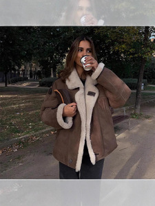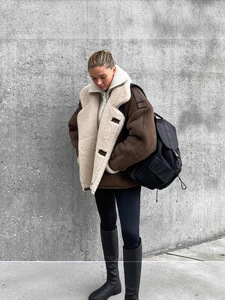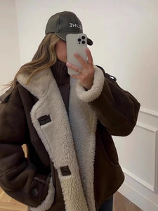 跨境欧美女装秋冬加绒加厚保暖舒适翻领毛领羊羔绒慵懒时尚外套