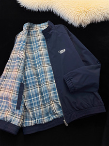 美式复古两面穿立领外套男女款格纹工装撞色拼接oversize潮牌夹克