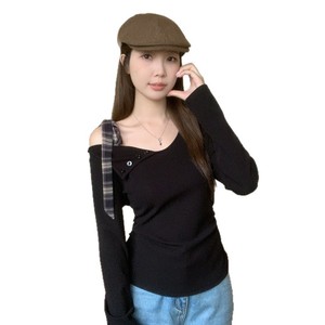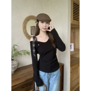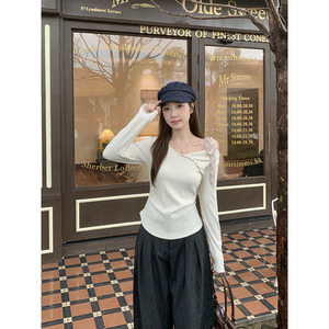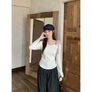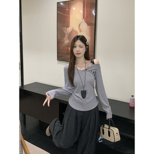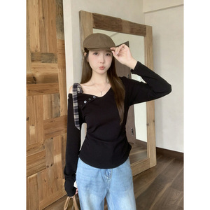 2025秋装新款大码胖MM韩系温柔风撞色绑带露肩长袖T恤