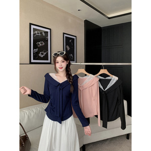 2025胖MM秋季新款纯欲风蕾丝拼接绑带长袖T恤上衣