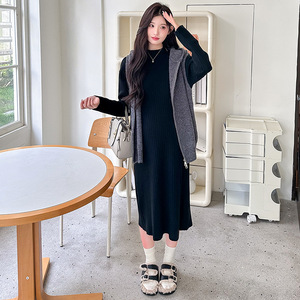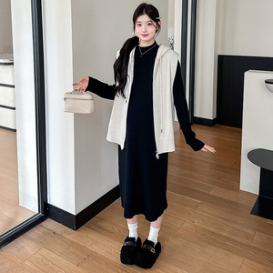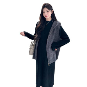 孕妇装韩版秋冬款休闲运动风连帽马甲+显瘦针织打底裙休闲两件套