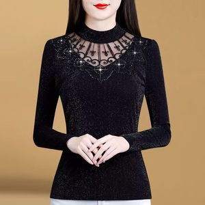 加绒/薄款秋冬蕾丝打底衫大码女长袖t恤洋气修身小衫显瘦网纱上衣