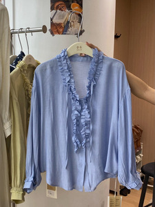 女式V领长袖衬衫早秋日韩休闲宽松丝光纯色落肩袖打底上衣