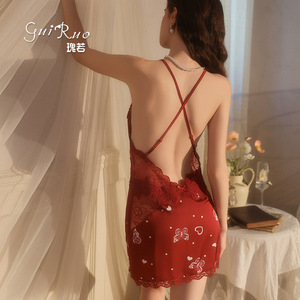 DZ瑰若品牌睡衣甜美纯欲印花火辣深V加胸垫丝滑缎面睡裙套装5185