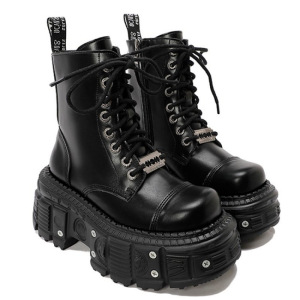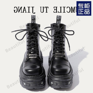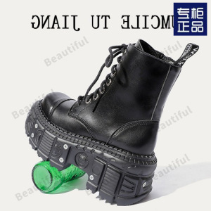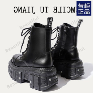 西班牙百搭女靴小众设计系带骑士靴女暗黑朋克金属松糕厚底短靴女