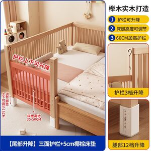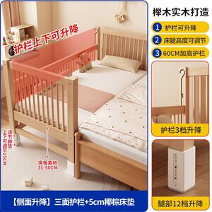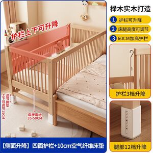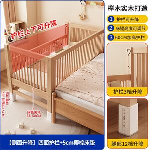 实木儿童床榉木拼接床加宽小床拼接大床升降护栏男女孩宝宝婴儿床