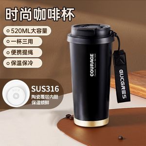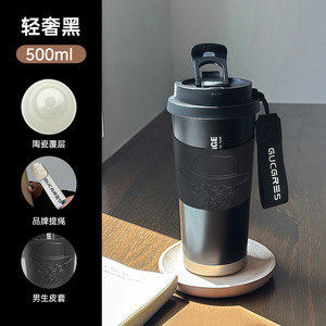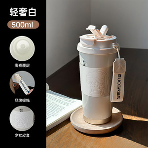 双饮水杯便携吸管杯子大容量办公室咖啡杯轻奢覆层陶瓷内胆保温杯