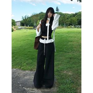 韩系一字肩长袖上衣女早秋波点拼接抽绳阔腿长裤两件套套装女系带