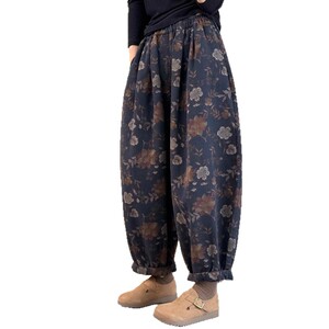 文艺复古斜纹棉印花松紧腰哈伦裤女2025秋新款宽松大码长裤 1013