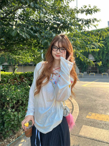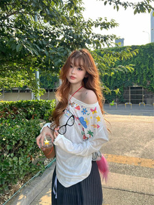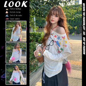 夏日微透白色斜肩防晒衫长袖t恤女夏季空调罩衫宽松显瘦露肩上衣