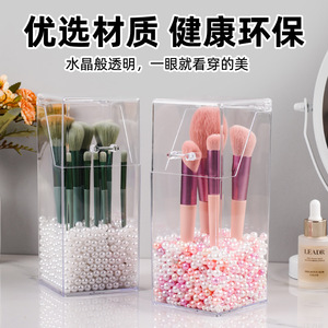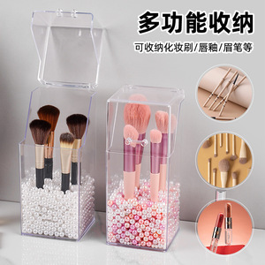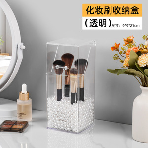 简约透明亚克力方形笔筒学生桌面整理收纳盒带盖化妆刷眉笔收纳桶