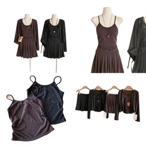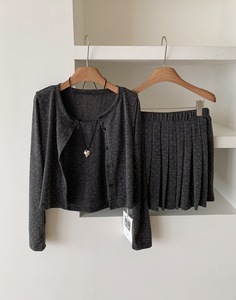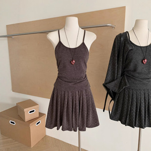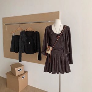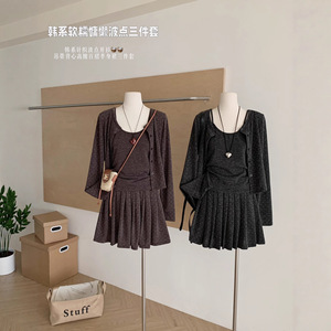 韩系波点防晒开衫吊带背心女秋2025高腰A字百褶半身裙针织三件套