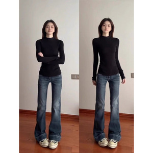 美式复古黑色高级感长袖半高领t恤女早秋紧身简约风百搭打底衫潮