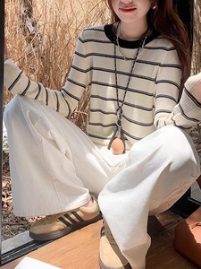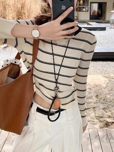 曾小咸 长袖条纹衣女早春chic新小个子修身针织打底衫设计感