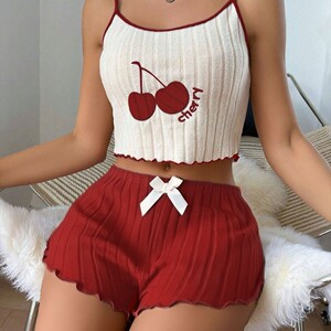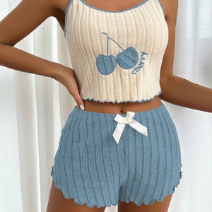 外贸欧美跨境女士家居服爆款刺绣螺纹磨毛吊带背心短裤女二件套装