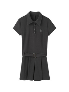 宋正恩polo领短袖衬衫连衣裙女夏季学院风气质收腰百褶灰色短裙子