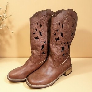 棕色复古西部牛仔女靴镂空款中筒靴复古刺绣骑士靴子粗跟马丁靴