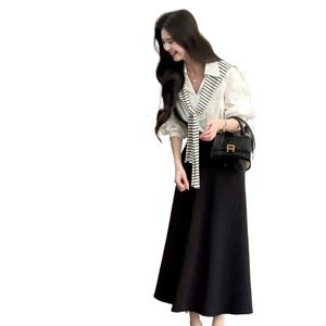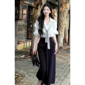 2025春秋新款设计感韩版长袖白色衬衫披肩上衣高腰黑色半身裙套装
