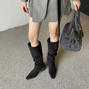 776-1 骑士靴女粗跟秋冬款西部靴高筒复古显瘦褶皱堆堆靴长靴宽口