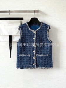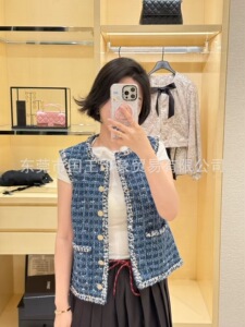 国王印象 秋季新款粗花条纹编织单排扣百搭圆领马甲名媛风外套女