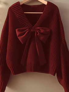 红色V领蝴蝶结宽松针织毛衣女装2025新款早秋季独特绝美高级上衣