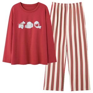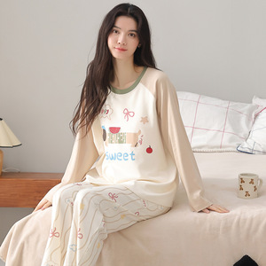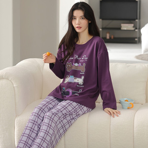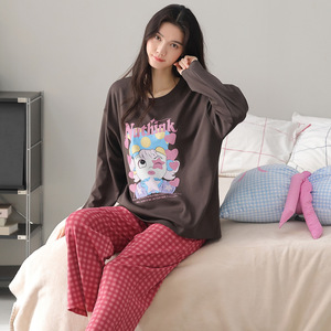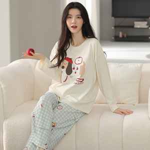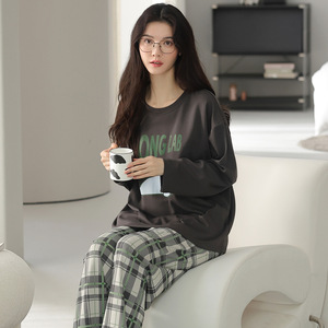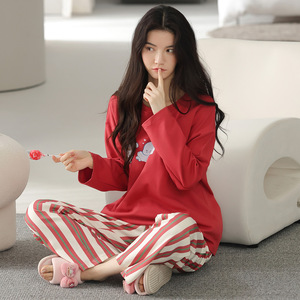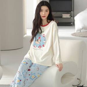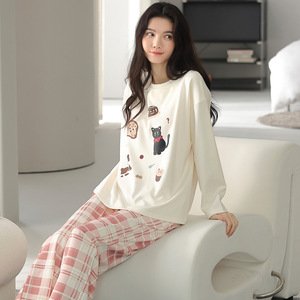 春秋季女士睡衣纯棉长袖长裤圆领套头甜美可爱宽松外穿家居服套装