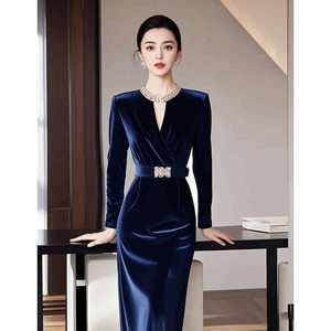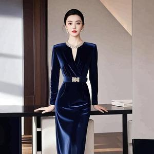年秋重要场合新品感气质长裙气场强大小香风蓝色丝绒连衣裙女