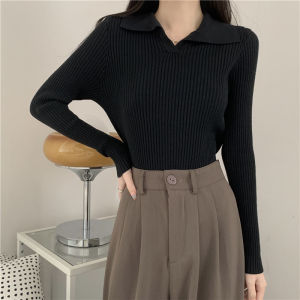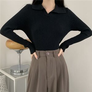 黑色polo领针织衫2025入秋上衣女辣妹显瘦内搭别致短款打底衫跨境