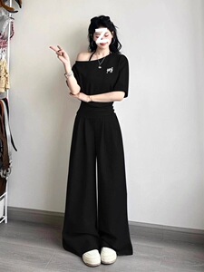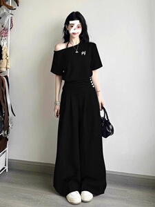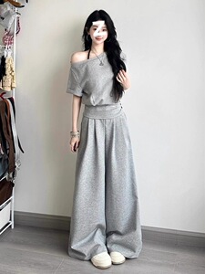韩系休闲运动套装女夏季新款慵懒时尚斜肩短袖t恤阔腿长裤两件套