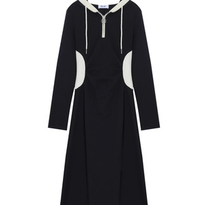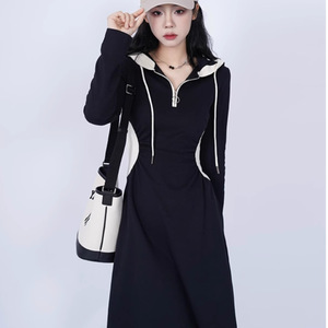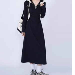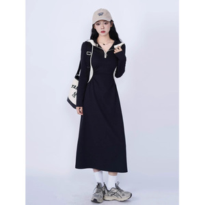 亚马逊速卖通eBay独立站连帽长袖连衣裙女秋季黑色设计感过膝长裙