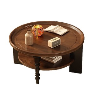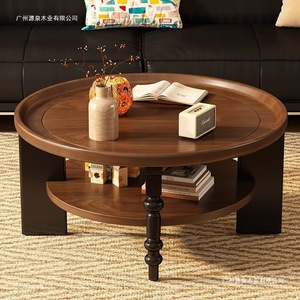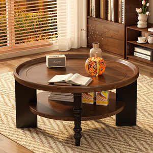 全实木茶几圆形茶桌小户型小桌子中古风家用客厅法式复古新款茶几
