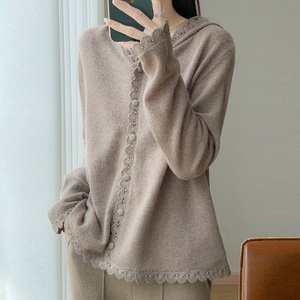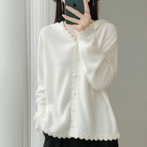 工厂直销100%丝光纯羊毛纯色花边连帽开衫女潮流风宽松外套针织衫