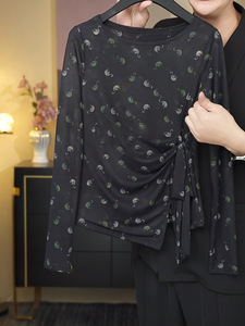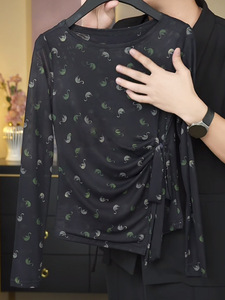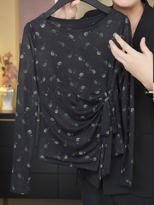 高级感别致印花长袖网纱上衣女早秋设计感绑带收腰T恤不规则罩衫