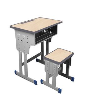 批发款单人双柱桌子+凳(木纹灰边)