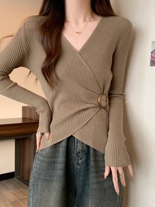 不规则交叉v领打底衫女2025新款春秋大码胖mm内搭上衣长袖针织衫1