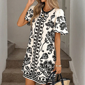 跨境亚马逊独立站外贸欧美风印花连衣裙2025夏季度假风短袖中裙女