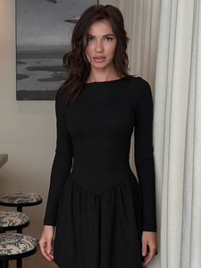 欧美外贸批发秋季新款气质高级感黑色长袖连衣裙女显瘦缩褶A字裙