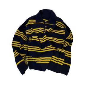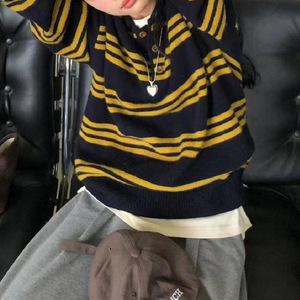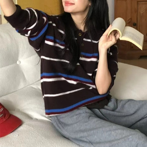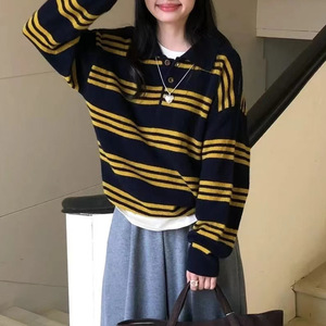 韩系风2025早秋新款长袖Polo领休闲撞色条纹针织衫跨境宽松针织衫