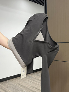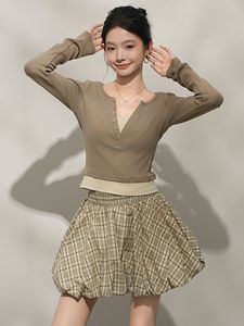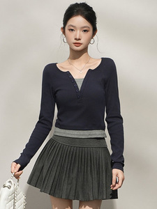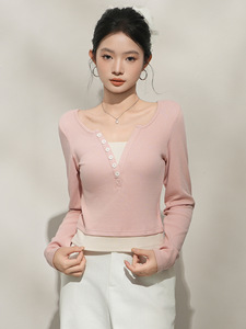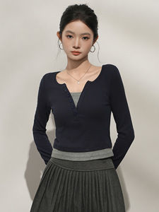 季优假两件正肩V领修身长袖打底衫t恤女秋季高级感绝美内搭短上衣