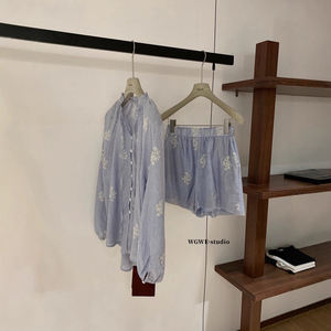 【WGWE】度假风刺绣长袖衬衫+短裤气质防晒套装 W6873#