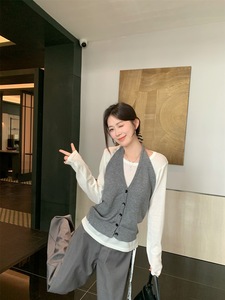 韩系穿搭灰色针织衫挂脖吊带水洗工装休闲裤女2025秋季新款套装潮