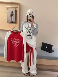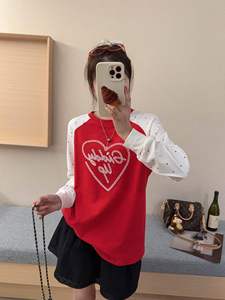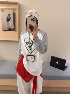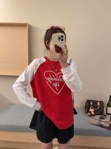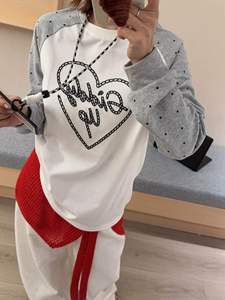 韩代字母爱心刺绣波点撞色插肩袖T恤女秋季新款宽松休闲长袖上衣