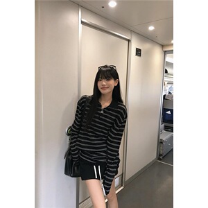 实拍 韩版休闲宽松中长款条纹T恤POLO领冰丝防晒针织衫女装87715