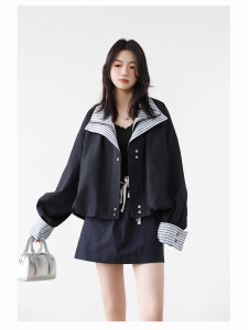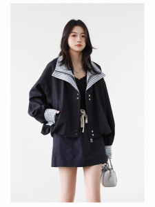 美式复古春季花苞风衣夹克女设计感拼接格纹双层翻领假两件短外套