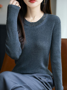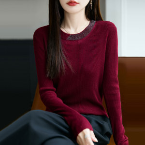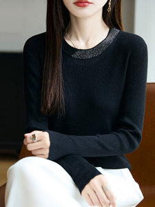 【厂家直供】纯色圆领烫钻针织衫女秋季气质显瘦薄款减龄打底毛衣