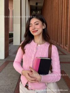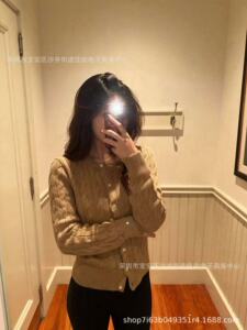 25早秋美式复古小马刺绣显瘦麻花棉针织开衫女绞花毛衣外套上衣
