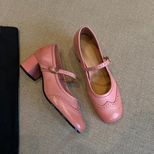 澜柜版~百搭一字扣浅口粗跟玛丽珍鞋女复古布洛克方头软皮小单鞋