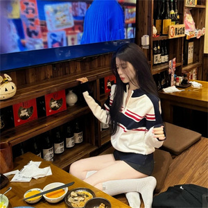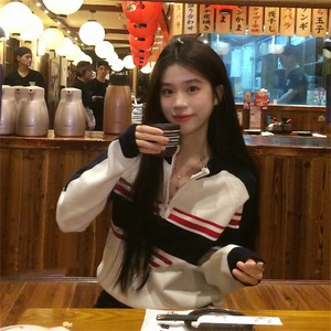 美式设计感半拉链百搭长袖女2025秋季复古运动宽松撞色条纹针织衫