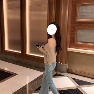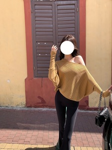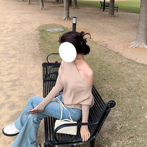 7668辣妹炸街设计感小众露肩针织衫女不规则斜肩慵懒蝙蝠袖上衣秋
