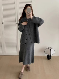 韩系针织两件套女秋冬新款慵懒风长袖毛衣开衫+中长款背心裙套装